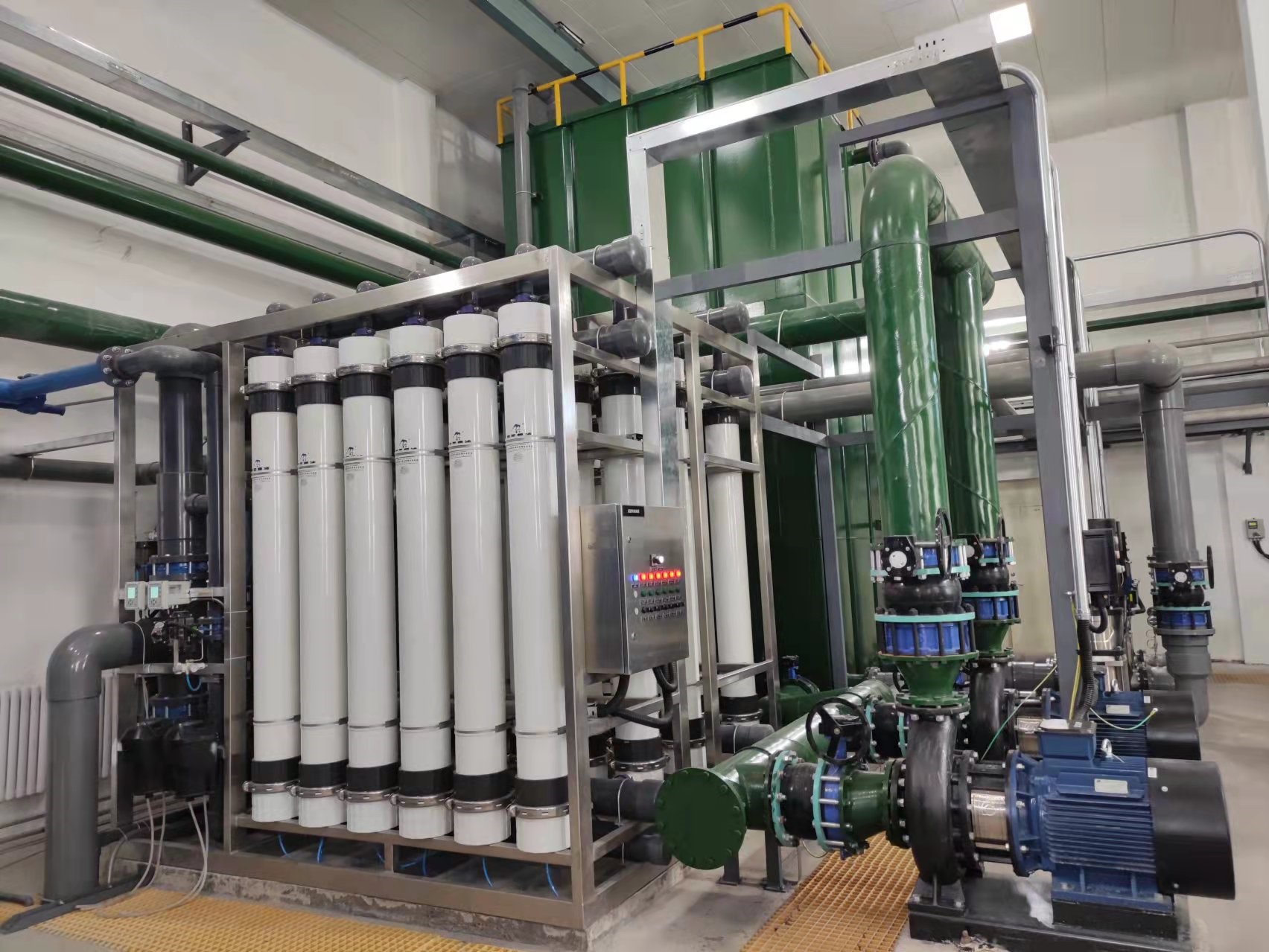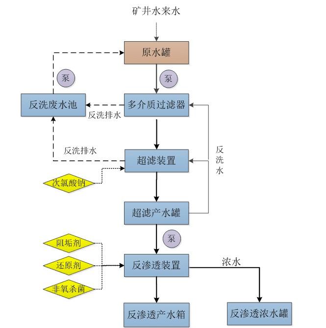 本項目的工藝流程:礦井水首先進入原水罐混合均質原水后,經泵提升至多介質過濾器,去除水中的雜質、顆粒物以及懸浮物及部分有機物后,進入超濾裝置,超濾產水進入超濾產水罐,經反滲透進水泵提升至反滲透裝置進行脫鹽處理,產水進入反滲透產水箱供給噴淋冷卻水使用,濃水進入濃水罐中儲存。